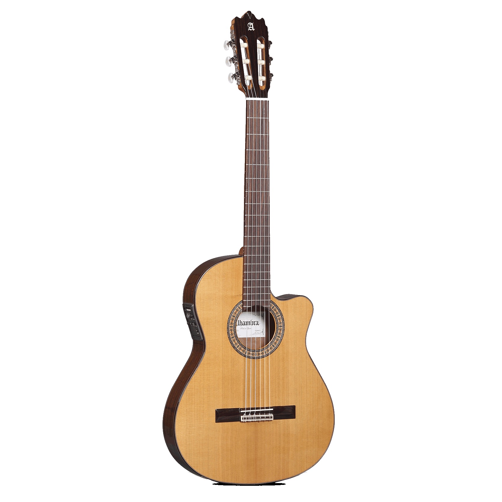 Alhambra 3C CTE1 är en klassisk spansktillverkad gitarr av hög kvalitet. Detta är en nylonsträngad gitarr med lite tunnare kropp (6,5 cm) och en inbyggd Fishman pickup. Solitt lock av cederträ, sidor, botten och hals av mahogny och greppbräda av rosewood.