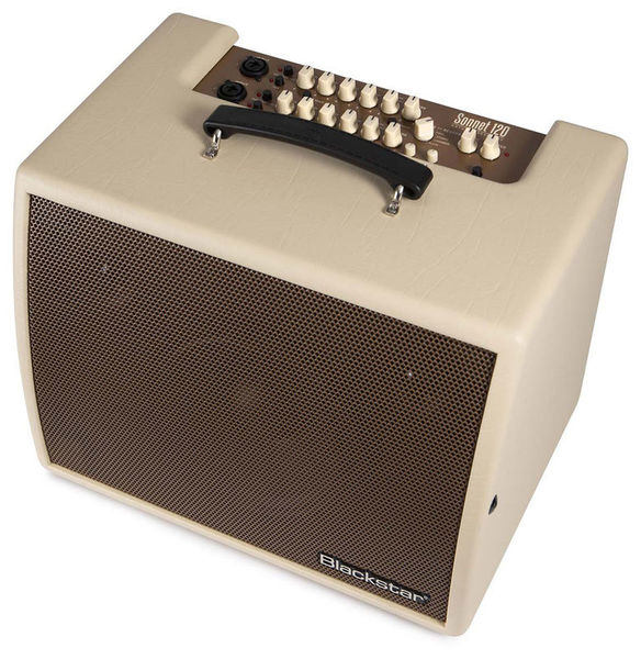Blackstar Sonnet 120 BL; Acoustic Amplifier; Channels: 2; Power: 120 Watts; equipped with: 8″ Speaker/s & Tweeter HF Driver: Controls: Kanal 1: Gain, Low, Mid, High, Anti Feedback, Reverb, Kanal 2: Gain Low, High, Anti Feedback, Reverb, Type(Hall, Studio, Chamber, Plate)Reverb Time, Master, H.P. Filter, Brilliance; Switches: Phase, Shape, Hall, Bluetooth, Ground Lift, Power; Effects: Reverb; Connections: 2x Instrument/Mic Input (XLR/6,3 jack combination inputs); Aux Input (1/8″ TRS-Jack),2x XLR (Pre/Post)1x Mix DI Output (XLR) Footswitch, 2x FX-Loop, USB Audio; Dimensions(W x H x D): 417 x 352 x 296 mm; Weight: 11 kg; Colour: Blonde, additionell footswitch: Blackstar FS-17 (#484870)