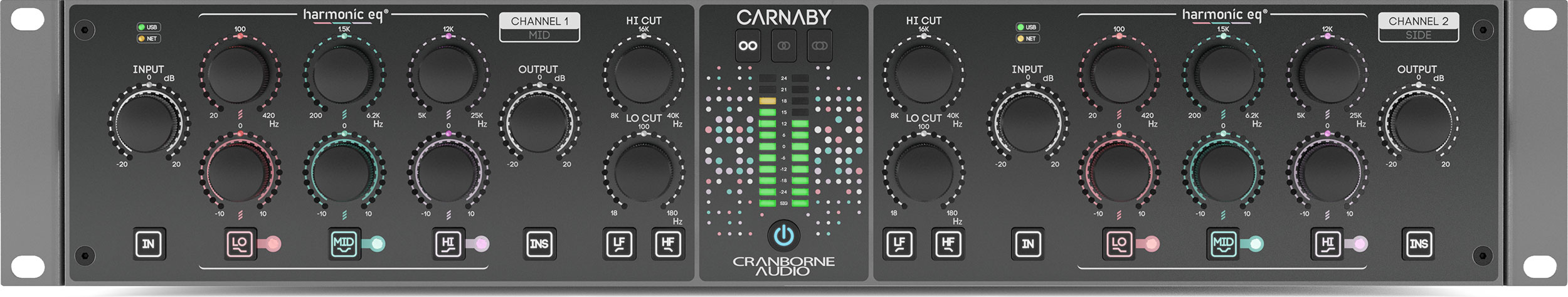 Carnaby HE2 HarmonicEQ erbjuder unik EQ med harmonisk mättnad för att förstärka och minska frekvensinnehållet. Den stöder flera bearbetningslägen inklusive stereo, dual-mono och mid-side. Dynamisk respons ökar total förstärkning och harmoniska när kretsarna belastas hårdare. Fullständigt digitalt-styrd med USB och nätverkskontroll för smidig hantering. Per-band-bypass möjliggör precisions-tonal justering och HF/LF-formning. Mid/side bearbetning ger separat applicering av HarmonicEQ® på mitten och sidan av stereosignalen. Inserts för extern hårdvara ger ytterligare flexibilitet och utökade möjligheter för ljudformning.