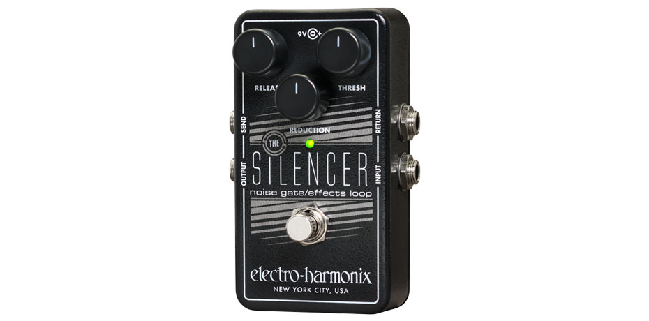 A sophisticated noise gate that can tame a single pedal or an entire effects loop! The Silencer”s three-control layout provides precise fine-tuning to fit your system, axe and playing style. Threshold adjusts how much level is required to open the noise gate and allow a signal to pass thru. Reduction regulated the degree to which the gated signal is reduced and is variable between -70dB and +4dB. Release controls how long the gate remains open after the signal drops below the Threshold. Release time is variable between 8ms and 4 seconds.I/O includes ¼ inch Input, Output, Send and Return jacks. The footswitch selects whether The Silencer is engaged or in bypass mode buffered bypass allows the effects loop to remain in your signal path when the gate is bypassed. A built-in AC jack accepts a standard power supply like the EHX 9.6DC unit (optional) and the pedal comes with a 9V battery.Conquer noise with The Silencer!