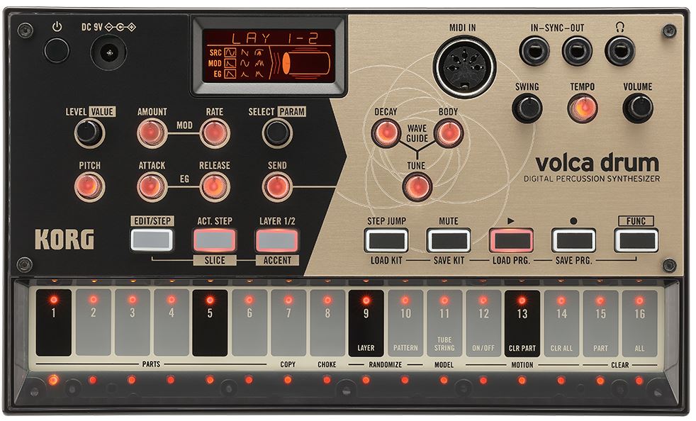 Digital percussion-synt med 6-part x 2-layer struktur. 2 oscillatorer, pitch modulator, amp EG och waveguide resonanseffekt.