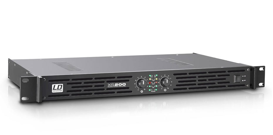 The XS200 is an extremely compact, dependable Class D power amplifier with an output of 100W per channel at 4 ohms and a transmission range of 20Hz – 20kHz. With just 1U and a weight of 3kg, it is conceived for all professional applications in which ease of transport or space is important, whether mobile, in installations or at home, since no fan is required.The XS200 is protected against short-circuiting, DC, overheating, and overloading and has a soft-start delay. The amplifier features XLR, RCA and jack input connectors, with Speakon-compatible sockets and screw terminals as outputs. Slide switches on the rear panel let you select the mode of operation and gain and activate the limiter and the ground-lift function for eliminating ground loop hum. LEDs indicate power, signal, clipping, triggering of the protection circuit, and the mode of operation. The XS200 impresses with its high dynamics, impulse fidelity, and transparent sound.