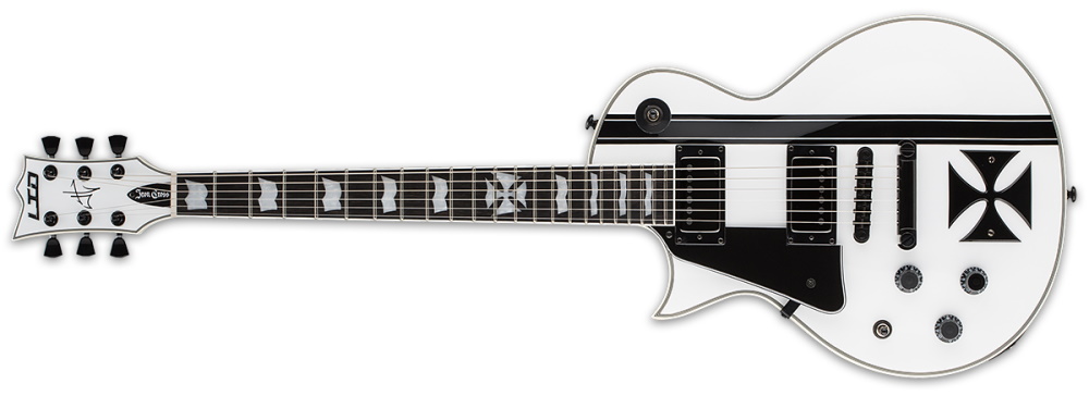 The LTD Iron Cross is a Signature Series model of James Hetfield, the frontman of Metallica and one of the world’s most highly respected rhtyhm guitar players in any genre. The Iron Cross is based on James’ personal custom instrument design, and features set-neck construction of a mahogany body with maple cap, and a three-piece mahogany neck with ebony fingerboard and 22 extra-jumbo frets with an Iron Cross inlay at the 12th fret. The LTD Iron Cross is powered by James’ own EMG JH SET active pickups, and includes a TonePros locking TOM bridge and tailpiece. Available in Snow White finish with black stripe graphic and iron cross fixture.