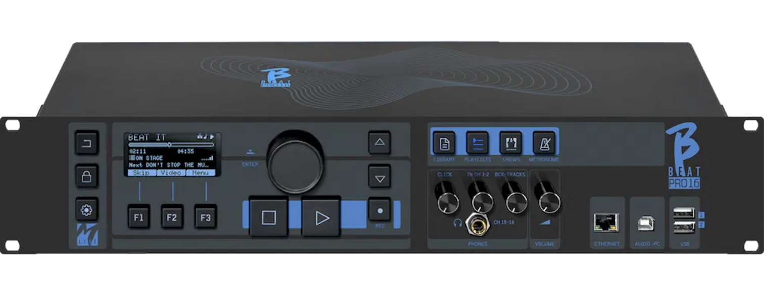 Den nya B Beat PRO16 PLUS spelar bakgrundsspår och videor med texter och noter, har ett 12 i 16 ljudkort, hanterar spellistor och shower. B.BEAT läser och spelar musikfiler i formaten WAV, Multitrack Audio, Stems, Midi, Video Mp4, Mov och JPG. Du kan använda backing-spår upp till 24 mono eller 12 stereospår, spela in upp till 12 kanaler. B.BEAT PRO16 PLUS kan lagra ett stort antal bakgrundsspår. Den har två HDMI-utgångar för att överföra video synkroniserad till musik och texter för scenprompter. Du kan ladda upp noter och visa dem på Wi Fi-anslutna smarta enheter. Den har en digital mixer för att justera de 24 ljudspåren, 16 separata utgångar, klick- och hörlurshantering. Fjärrkontroll via App via Wi Fi eller kabel, Midi Clock skicka.