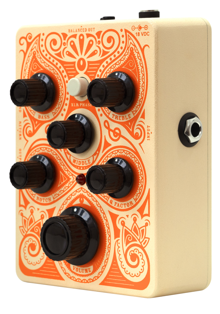 3-bands EQ med parametrisk Mid och Notch-filter, effektretur, omkopplare för fasvändning på XLR-utgången, volymkontroll och 18V strömförsörjning (ingår) vilket möjliggör extremt bra dynamik.