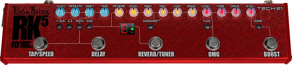 RK5 v2 behåller samma delay med taptempo, en kraftfull boost och Richies Signature OMG-overdrive. Nya funktioner inkluderar en oberoende reverb med val av rumsstorlek, ett rotary högtalarläge, kompressor, fuzz, en stämapparat, hörlursutgång och en XLR-utgång.