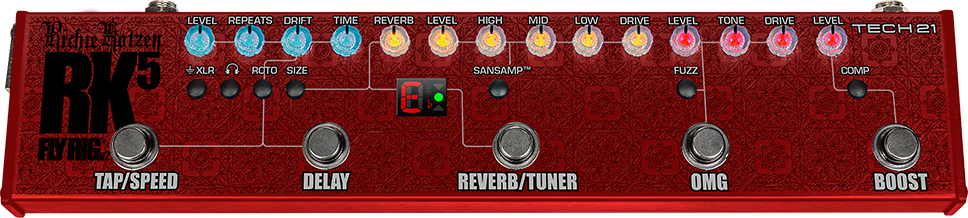 The RK5 v2 retains the same delay with tap tempo, a powerful boost, and Richie’s Signature OMG overdrive. New features include an independent reverb with choice of room size, a rotary speaker mode, compression, fuzz, a tuner, headphone capability and an XLR Output.